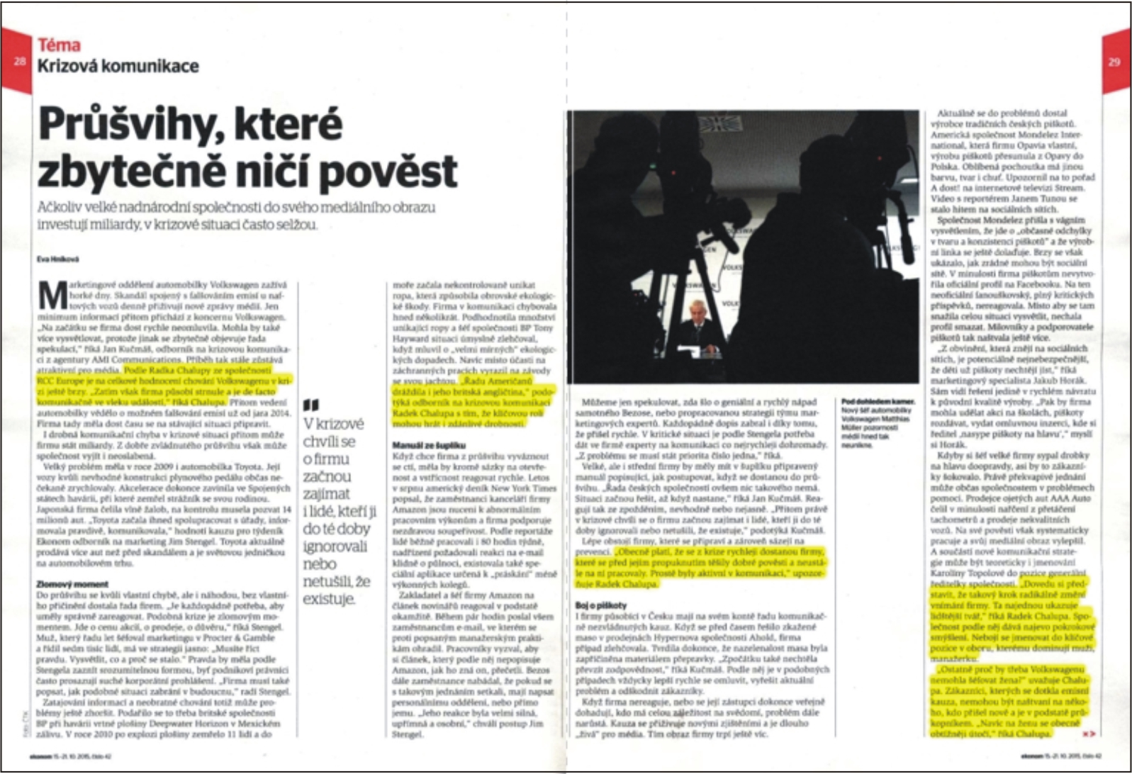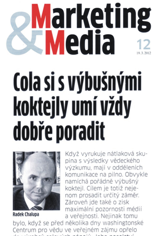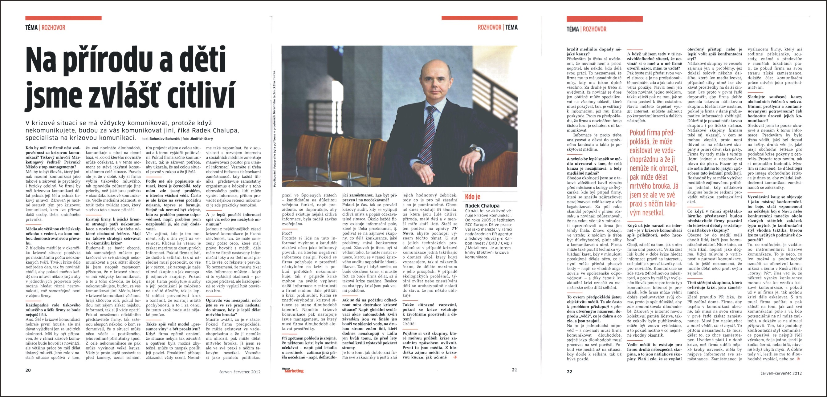 Mgr. Radek Chalupa spojuje zkušenosti z více než osmnáctileté práce na zvládání krizových situací, korporátního marketingu a komunikace, ochraně a řízení dobré pověsti, ochraně a rozvoji brandu pro přední zahraniční i české společnosti s prací v médiích a ve veřejné správě. V současnosti pracuje jako ředitel firmy RCC Europe. Je autorem knihy Efektivní krizová komunikace – pro všechny manažery a PR specialisty, Praha, Grada Publishing 2012. Do jeho klientského portfolia patří mimo jiné společnosti Commercial Union (dnes Aviva), Český Telecom (dnes O2), Danone, Hipp, Kempinski Hotels, Karbon Invest, Komerční banka, Master Foods, Novartis, OKD, Raiffeisen stavební spořitelna. Radek Chalupa pracoval pět let jako tiskový mluvčí koncernu Karbon Invest, respektive Českomoravských dolů, Metalimexu a OKD (Ostravsko-karvinských dolů). Řadu cenných zkušeností nasbíral jako ředitel francouzské PR agentury Euro RSCG Corporate Communications, respektive Account Director americké PR agentury GCI Prague, kde působil zároveň jako člen Center of Corporate Excellence v rámci GCI Europe. Podnětné zkušenosti nasbíral také díky práci pro Fond ohrožených dětí, Informační centrum nadací a Rotary Club Prague International. Práci v řízené komunikaci přecházela aktivní kariéra v elektronických médiích, v jejichž rámci Radek Chalupa pracoval v České televizi a v privátním zpravodajském Rádiu Alfa. Na počátku své kariéry pracoval jako osobní asistent poradce ministra zahraničních věcí ČSFR, respektive ČR. Aktivně se podílel mimo jiné na misi jejímž výsledkem byl zisk tzv. zvacího dopisu z někdejšího Sovětského svazu a účastnil se historicky prvého formulování českých národní zájmů.